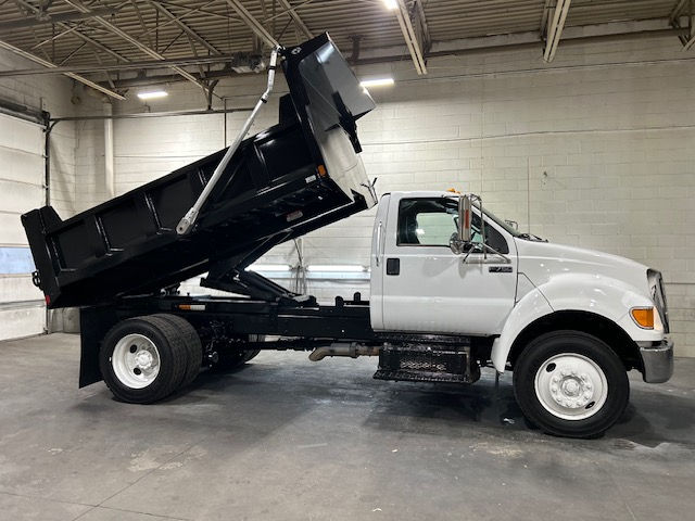 Nice 2011 Ford F750 dump truck. Features air brakes, 11R22.5 tires, two wheel drive, A/C and radio, and pintle hitch and towing package.