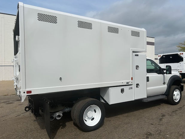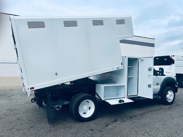 New, 2025 12ft Forestry Style Chipper Body. L-Package storage set up as well as lockable ladder/storage box. 96" x 12ft by 66" tall. 30" rear barn gate style doors. Interior Box rubberized coating, LED Light package and markers, EMDA double acting hoist kit, 13 ton lift at 50 degrees, push button controls, dual rear tires, pintle hitch and towing setup, A/C and radio, and hydraulic disc brakes. Includes 3 Year Warranty on chipper body and 1 year warranty on hoist and pump.