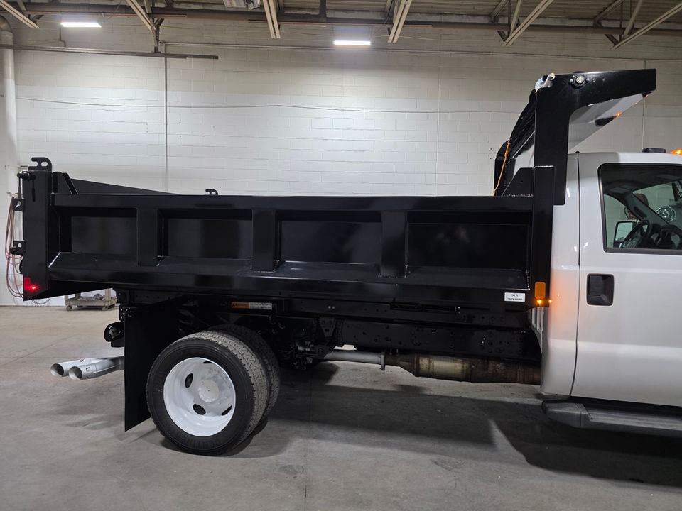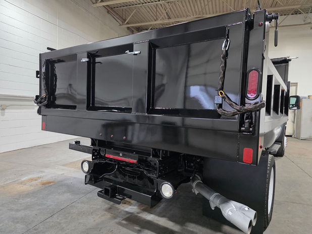 Features a NEW 96"x11'3" Mason/Contractor Dump Body w/20" sides & 26" multi-function tailgate. It is equipped with all LED lighting on the body and a New Campion CS 620T Double acting hoist capable of lifting 10.4 tons. The truck does have disc brakes, AC, radio, power windows, spotlight, adjustable and extendable mirrors, Good Bridgestone tires, and towing package.